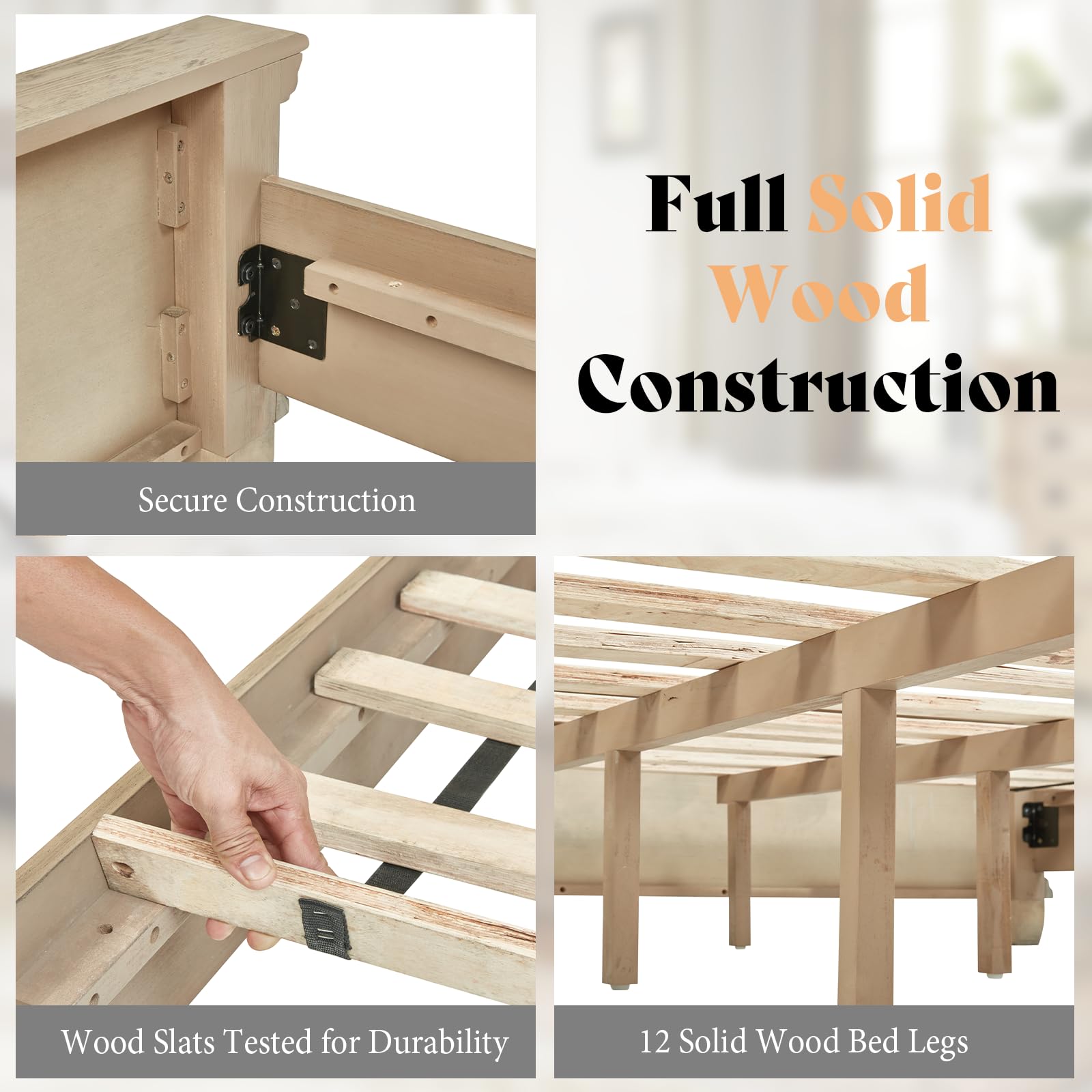 - 100% Solid Wood Frame: this wooden bed frame built with natural solid wood for superior strength, stability,and longevity, guarantees a sturdy foundation that endures daily use.