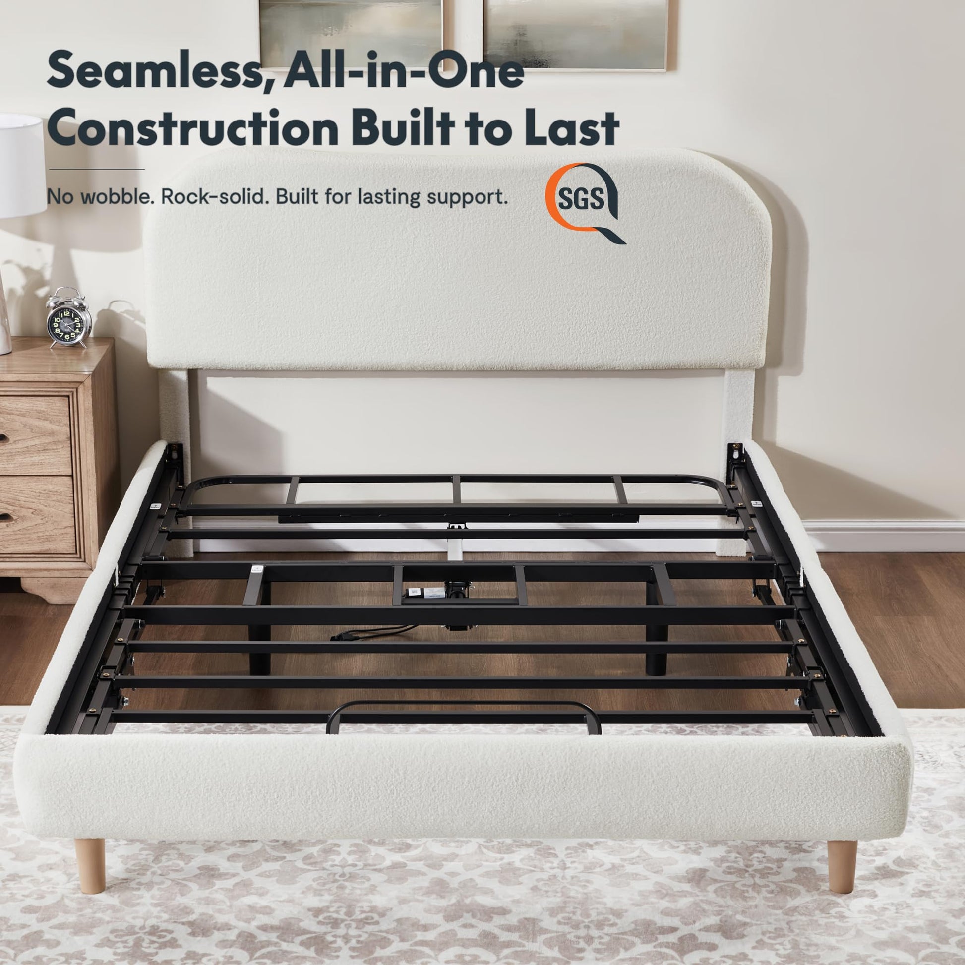 - All-in-One Adjustable Bed: Why settle for a regular bed frame or a clunky adjustable bed base? Our All-in-One Adjustable Bed combines head & foot lift function in an adjustable base, with the added benefit of a cloud like upholstered bed frame with textured boucle fabric — finally, an adjustable bed that feels as modern as your lifestyle.